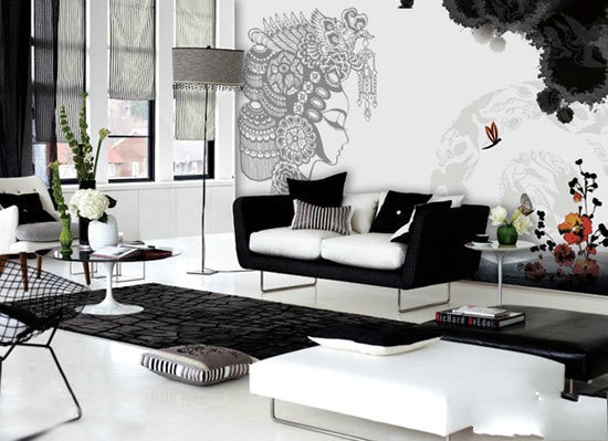 以黑白色为主色调的客厅设计,散发着一种成熟稳重的气息。而用昆曲的妆容人物图案,搭配晕开的墨汁,立刻就让这个客厅显得与众不同。