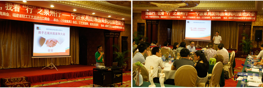 5月29日,由工艺资源网、家具资源网、《宁波家具》杂志联合承办的“饰品行,我看‘行’之泉州行——宁波家具团饰品采购对接洽谈会”在泉州酒店南馨楼二楼凤凰厅隆重举行。此次会议吸引了宁波拥有八大子品牌,十二家子公司的中国500强企业——富邦家具(集团)有限公司、全国已有300多个加盟店的多贝尔家居制品实业有限公司以及庄和、万尚、绿之岛、天圆明清、哲家、皇家、戈瑞美、万华等十几家家具生产企业,生活饰界、拉维佳等饰品经销商和大木匠、天络、丙午日、绳加友、西点装饰等软装设计公司报名参加。福建的二十几家家居饰品企业也踊跃报名参加了此次的对接活动,如:南洋、千禧、辉艺鹏、安盈、赛尔加、弘博等。