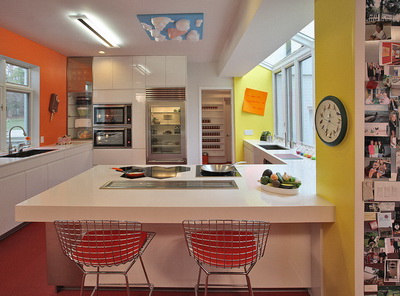 霓虹黄和橙色最适合搭配到一起了,放在靠墙的位置用自然的光线呈现,可以缓冲强度。我喜欢这一大片的颜色让这本来是白色的厨房带来冲击力。