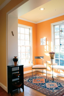 这又是另外一个充满阳光的鲜艳的彩色空间,墙上是鲜艳的橙色。这是个较为饱和的橙色,但是那漂亮的超大型的窗口把这个油漆的区域分割开来了,所以这样的成色并没有太强大的压倒性。天花板上偏黯哑的橙黄色则给墙壁一个对比的空间。在这里如果使用白色的天花板就显得有点冷,而且和橙色搭配起来就显得不和谐了。
