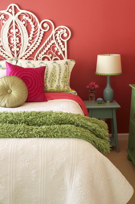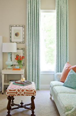 橙色和蓝色。他们在色轮上处于对角位置,而这样的矛盾会让他们成为天生的一对。如果你不喜欢这样的橙色和钴蓝色的房间,那就闭嘴吧。这个祥和的空间由仓爱的绿松石色和珊瑚色组成,这种稀释过的橙色和蓝色还是不减他们相互克制的局势。