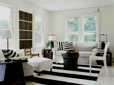 海军色和白色。笔挺的白色点缀于一片海军蓝之中,永远都不会过时,海军蓝和白色构成的房间当然也不会老土。如此搭配,就不难达到海军的特色(条纹、帆船、白色亚麻布) 。但是这个房间只是轻轻在你耳边呢喃:海军色的墙,配上白色的木制品,还有白色的咖啡桌,超大的地毯把所有的场景都呈现出来了。