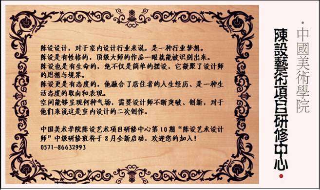 中国美术学院开设陈设艺术设计师培训项目,力求打造浙江乃至长三角地区的陈设艺术培训研修基地,并力争在全国范围内确立杭州的陈设艺术之都地位。