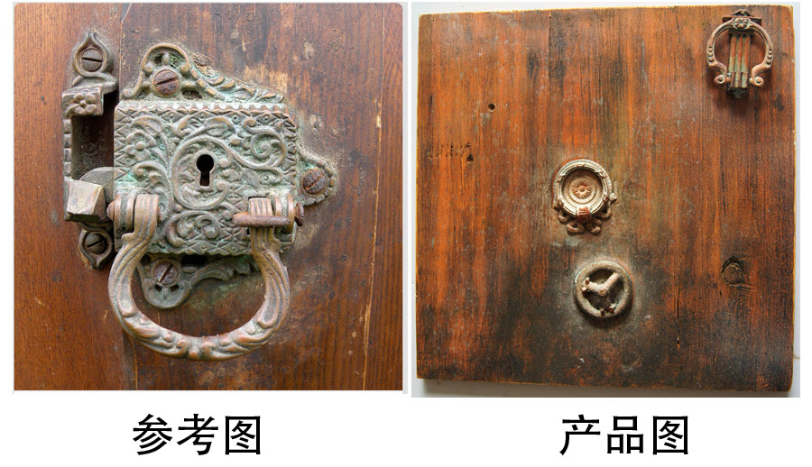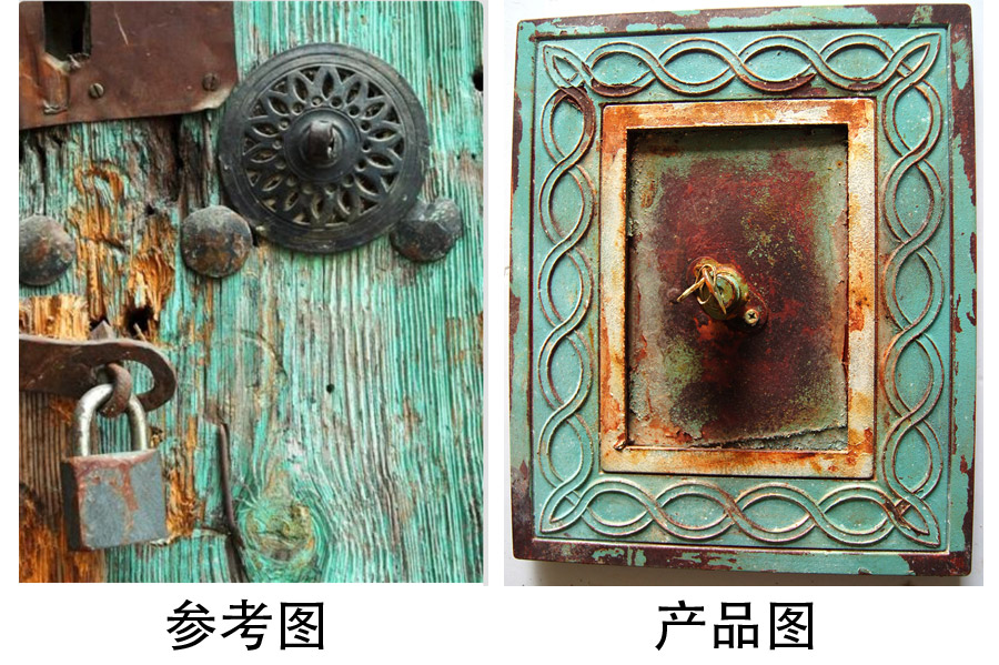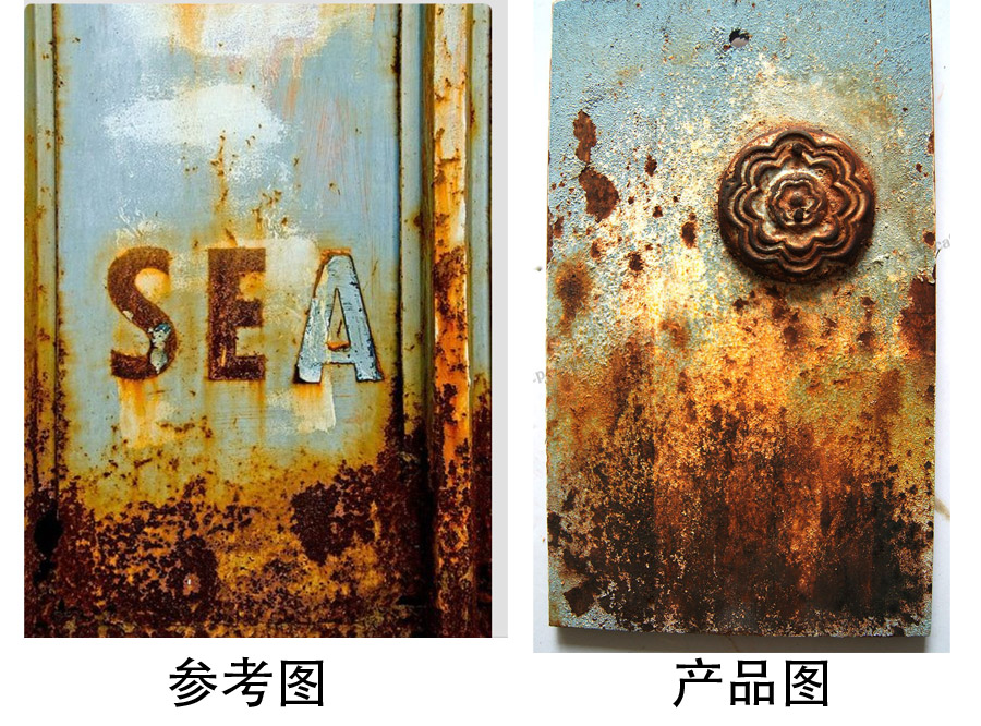 1、下图注重的是锈色的过渡表现,以及部分位置的剥落效果。“产品图”上凸起的配件,借鉴“参考图”上文字的整体锈色,使该配件在没有锈色的地方更加显眼。
