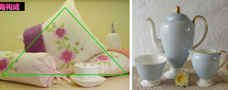 正三角构成:适合小型,套件和桌面类产品,例如图片中的布艺系列,日用茶壶系列。