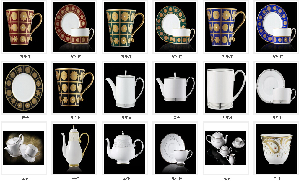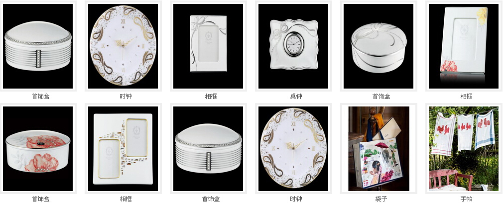 的产品种类还包括豪华钟表、咖啡具、茶具、相框、花瓶、等家居装饰品。