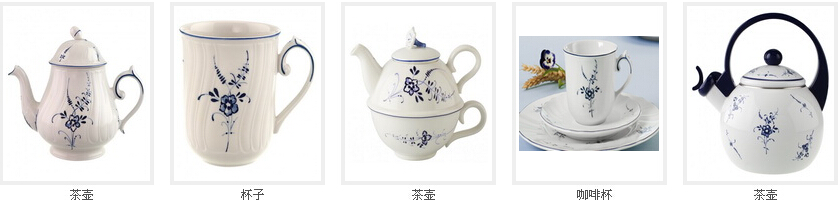 产品有茶壶、咖啡壶、咖啡杯、茶杯、糖罐、牛奶壶、杯碟等。