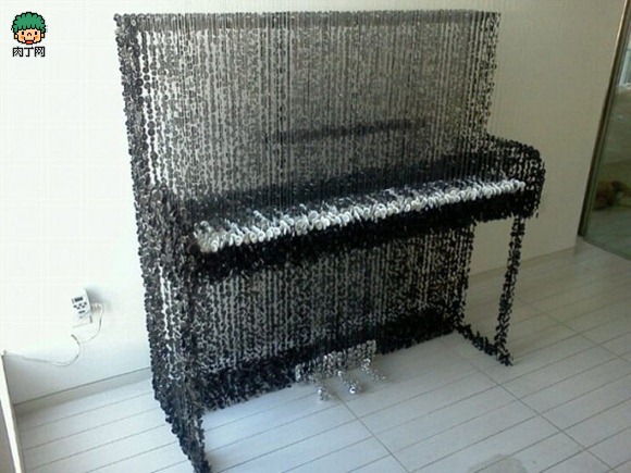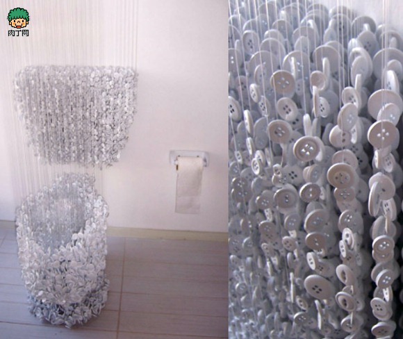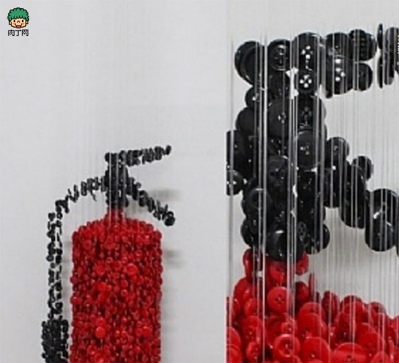 当用鱼线把纽扣穿起来会得到什么呢?迈阿密艺术家 Augusto Esquivel 在这里诠释了用处,利用不同长度的鱼线,穿插不同颜色的按钮,制作了一个个3D的雕塑,钢琴、消防栓、马桶等等。