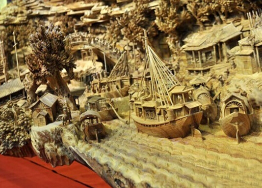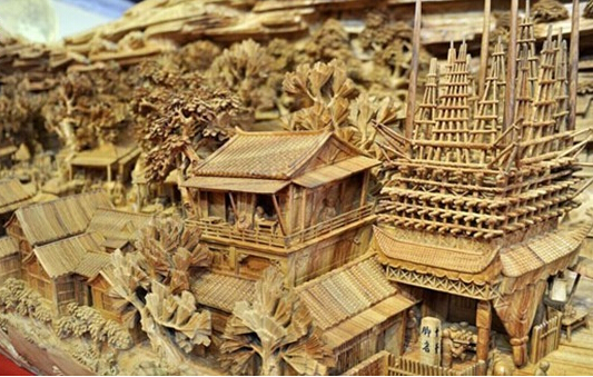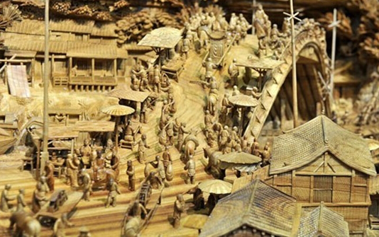 它复制的就是我国著名的绘画清明上河图,雕塑展示了一个立体生动的场景,当时人们生活的细节。