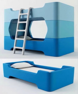 伦敦设计师Marc Newson为意大利家具厂商Magis设计了一款双层床,采用类似乐高积木的模块化设计,整张床由5个部分组成:两张单人床、一个梯子和两个起到支撑作用的隔断。既可以拆开当单层床使用,也可以搭在一起当双人床使用。