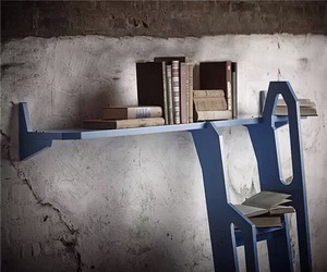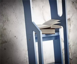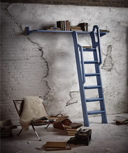 除了横栏可以放书之外,梯子的梯面挺宽,可以随手放入几本正在阅读的书籍,或合或张,错落却有秩。梯子上的左右两个扶手平行不等位,增添了扶手高度的同时也为整体以等长平行线为主的设计带来新奇的不平衡感。