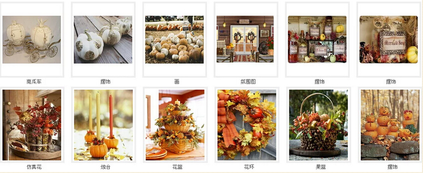 3、感恩节|丰收节,以南瓜为主题,产品包括花环、果篮、南瓜摆饰、南瓜烛台、南瓜花盆等。