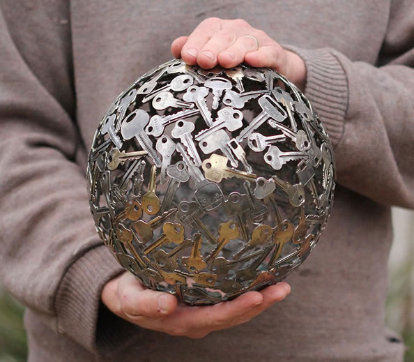 如图,我们看到的这些酒瓶、酒杯、圆球、橄榄球和水果盘等,都是使用废弃的旧金属钥匙打造而成。