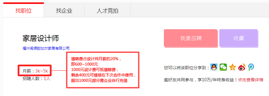 人才招聘:因企业对人才要求不同,服务费用也有所不同,猎聘费占所招聘的设计师月薪的20%,月薪由企业决定,若猎聘费未满1000元,余额可进行第二次使用;若超出1000元,超出部分需企业自行充值。