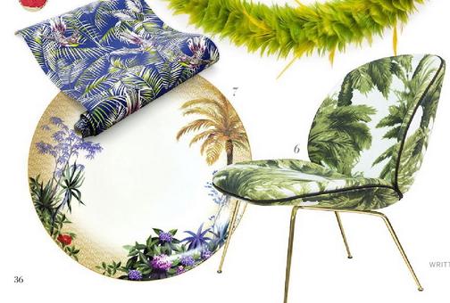 湖边色调和夏威夷的热带雨林图案——棕榈叶、凤梨、天堂鸟,用他们的方式转换为家纺、地毯、配件。