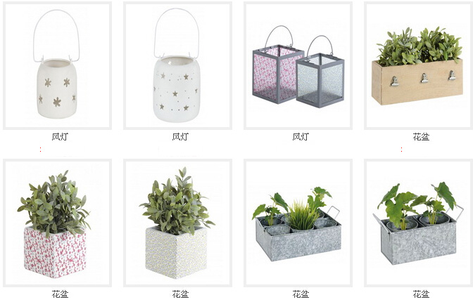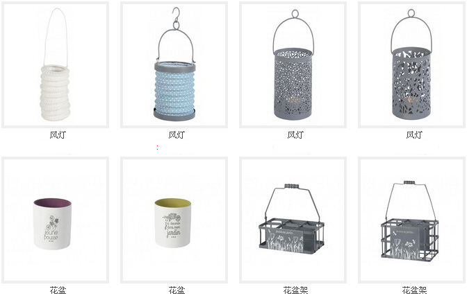 2、花园,主要为风灯、花盆。材质包括有五金、铁件、陶瓷、布制品。