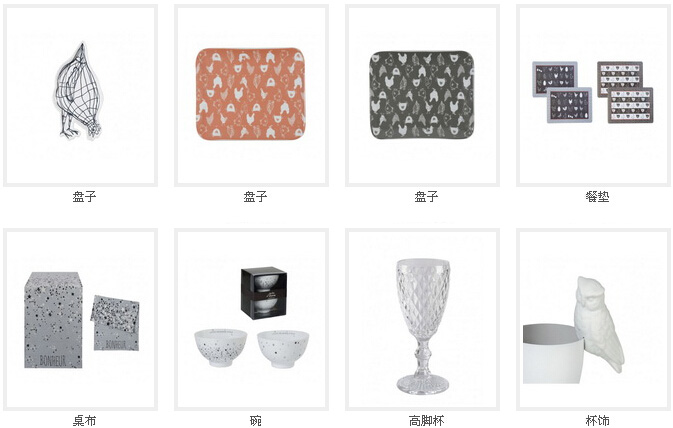 5、餐厨用品,包括有陶瓷餐具、马克杯、餐垫、围裙、餐巾、面包盘、砧板等。材质包括有木制品、日用陶瓷、五金、布制品。