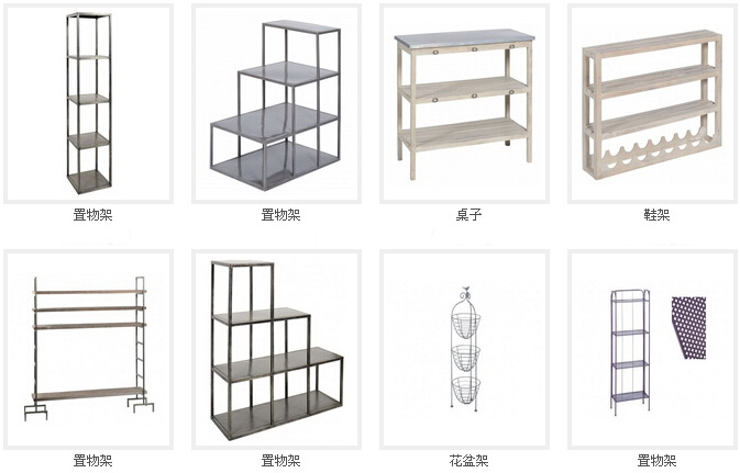 6、家具,包括有桌子、椅子、边几、花盆架、置物架。材质包括有木制品、五金、铁件。