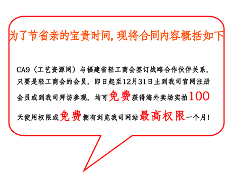 ,2016年再与福建省轻工工艺品进出口商会签订了合作协议,成为了福建省轻工工艺品进出口商会的战略合作伙伴。同时,工艺资源网为了回馈广大会员,携手福建省轻工商会,于合作协议中推出以下福利: